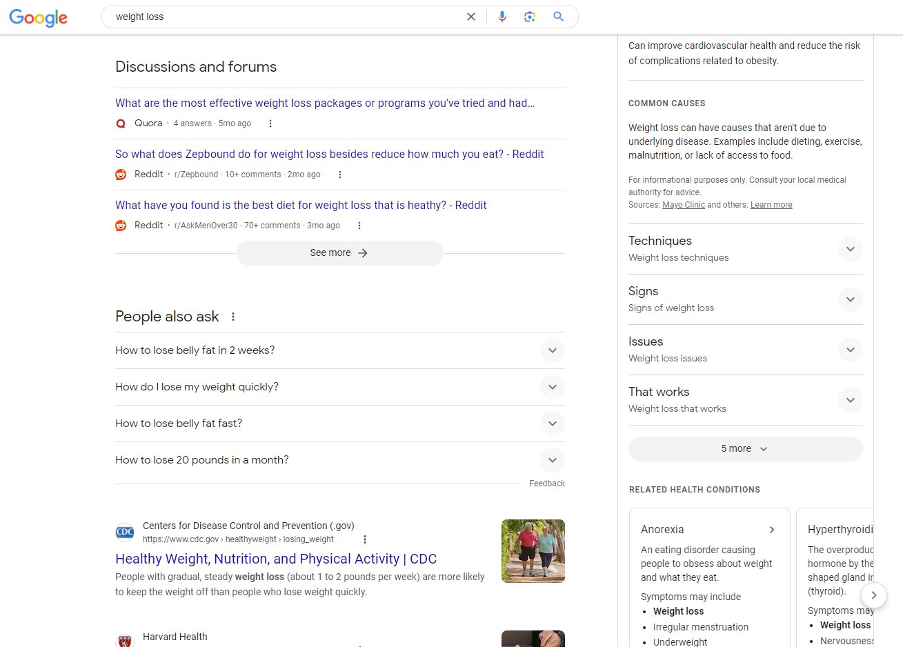 This came up when Lily Ray posted on X an example of the discussion and forums section showing Quora and Reddit threads for the query [weight loss]. She wrote, "Why, then, is it ok for Google to add a "Discussions and Forums" carousel above all of these E-E-A-T-driven medical results when we are seeing very clearly how Reddit is being overtaken by affiliate spam and scammers?"
